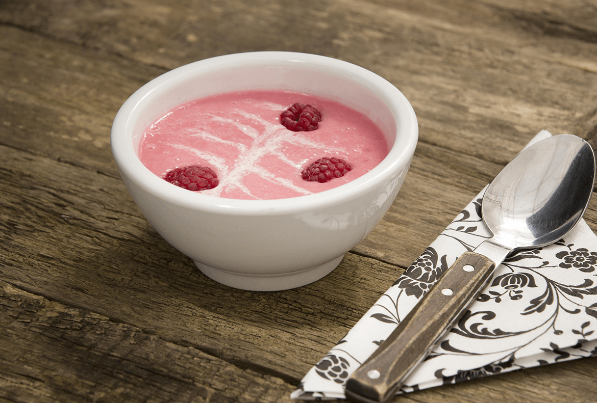Hűtőben hűtsük le. Pár csepp tejszínnel, málna darabokkal, bazsalikom levéllel díszítsük.